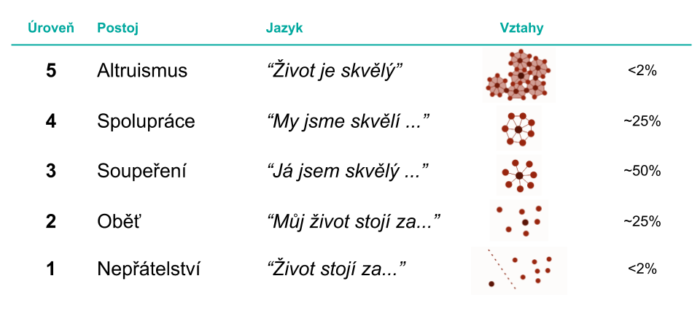 Tyto a další skupiny definoval David Logan se svým týmem v knize Tribal Leadership. Na jeho základě definujeme kulturu jako soubor kolektivně (nevědomky) akceptovaných přesvědčení, která tvoří konstelace emocí a myšlenek a ty spouští automatické vzorce chování v daném kolektivu. David a jeho tým prokázali, jak souvisí náš jazyk a forma vztahů s kolektivním přesvědčením. Stačí si na pár minut sednout do kuchyňky, poslouchat formu jazyka, kterou hovoří zaměstnanci a vidět vzorce vztahů, které se zde tvoří. Přínos práce týmu Logana a spol. je také v tom, že ukázal souvislost mezi vyšší úrovní kultury a výkonností, resp. motivací a loajalitou zaměstnanců. Čím vyšší, tím vyšší.