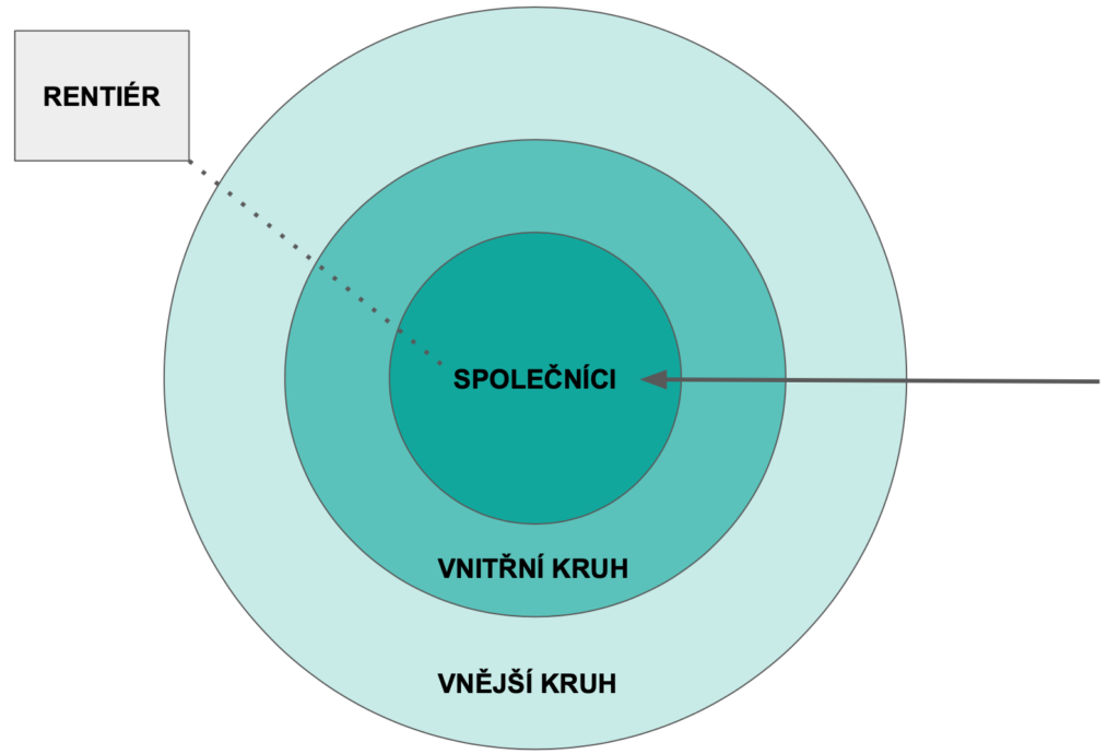 Doba, kdy měli RainFellows právě 4 zakladatele, kteří si nedokázali představit že to bude někdy jinak, už je dávno pryč. Vše odstartovala diskuse na BusinessConu, kdy se ostatní majitelé firem zeptali, proč firmu neškálujeme. A tak postupně vznikl systém kruhů, který připomíná vrstvy cibule, kde se pod každou slupkou skrývá těsnější a těsnější vazba. Na začátku člověk s námi spolupracuje jako kontraktor, a pokud se nám spolupráce vzájemně zamlouvá, stává se postupně zaměstnancem RainFellows, tedy součástí vnitřního kruhu. Důležitou podmínkou je to, že máme stejné hodnoty a rozumíme si spolu také jako lidé. Ve chvíli, kdy všichni ve vnitřním kruhu cítíme, že je to tak, jakoby k nám patřil věčně, je při souhlasu všech stávajících majitelů zapsán jako spolumajitel do rejstříku a stává se oficiálně spolumajitelem firmy. Poslední úrovni je rentiér, což je někdo, kdo už odchází do konzultantského důchodu, ale to při tom, jak nás to všechny naplňuje asi ještě dlouho nebudeme řešit.