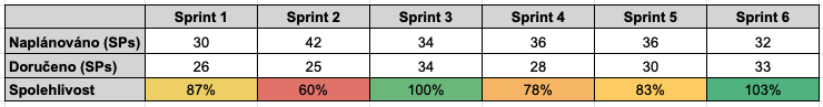 Je žádoucí doručit na konci Sprintu to, k čemu se jako tým zavážeme na začátku Sprintu. Jako první metriku tak můžeme sledovat v procentech, kolik práce (například story points) si tým naplánoval a kolik reálně doručil. A doručil znamená opravdu hotovo podle Definition of Done, nikoliv rozdělanou práci, kterou už jen zbývá nasadit nebo otestovat poslední scénář. Za dobré číslo osobně považuji úspěšnost >90%. Cílem hry však není se nesmyslně honit za tímto číslem, ale sledovat trend a to, zda se k této úspěšnosti postupně blížíte. Dobrým ukazatelem zlepšování týmu je také to, nakolik je číslo stabilní nebo zda kolísá nahoru a dolů Sprint od sprintu. A samozřejmě by aktuální stav a jak jej zlepšit mělo být pravidelným tématem na týmové retrospektivě.