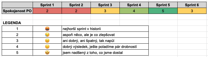 Zažil jsem spoustu týmů, které měly stabilní úspěšnost plánování, v týmu panovala skvělá nálada, jen PO nebyl spokojený. Asi si říkáte, jak je to možné? Někdy Scrum Master nebo Agilní kouč příliš bránil tým před PO, jindy zase tým plánoval málo práce do Sprintu a PO nesměl říct ani popel, protože commitment je přece záležitostí týmu. Přirozeně taková situace vede dříve nebo později k tomu, že máme na palubě frustrovaného PO. A proto měřím na pravidelné bázi i spokojenost PO s doručováním Cíle Sprintu. Opět na škále od 1-5, kde 1 znamená absolutně nespokojený a 5 značí spokojeného PO. Toto hodnocení zaznívá na Review Sprintu a je opět vstupem do Retrospektivy, kde se o tom jako tým společně bavíme. A to včetně PO, který je vždy součástí společné Retrospektivy. Jsme všichni přece jeden tým. Spokojenost PO může také rapidně ovlivnit SM/AC a to tím, že má pravidelné 1on1s a baví se spolu o týmu, businessu i o tom, jak jim funguje vzájemná spolupráce a dávají si zpětnou vazbu (nejen negativní, ale i tu pozitivní).