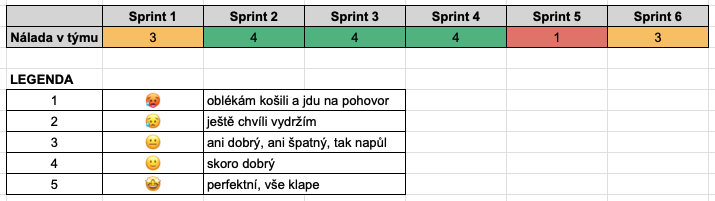 Je prokázáno, že spokojený a motivovaný tým dosahuje dlouhodobě lepších výsledků. Tým může velice dobře motivovat Product Owner (PO) smyslem práce. Spokojenost může zase ovlivnit SM/AC pravidelnými rozhovory s lidmi a odstraňováním překážek, ať už individuálních nebo týmových. Náladu týmu měřím po každém Sprintu jednoduchou škálou od 1 do 5, kde 1 znamená “oblékám košili a jdu na pohovor do jiné firmy“ a 5 značí perfektní náladu. Pro lepší představu si ke každé hodnotě můžete dát smajlíka vyjadřujících příslušné rozpoložení. Nehoním se opět za maximální spokojeností každý sprint. Tak jako v přírodě se čas od času objeví bouřky, tak i tyto výkyvy ve spokojeností lidí nemusí být na škodu a mohou tým posílit. Důležité je se o výkyvech bavit a sledovat trend. Jakmile dojde k odchylce oproti trendu, je to dobré si vždy zvědomit, co je za tím. Díky tomu zachytíte negativní náladu v počátcích a neroztočí se spirála negativní energie. Doporučuji také vnímat trend spokojenosti jednotlivých členů týmu a zařadit diskusi jako pravidelné téma na vaše 1on1 se členy týmu.