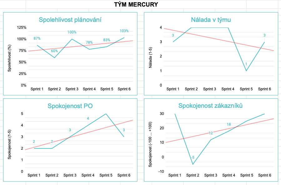 Zde je příklad metrik za poslední dva kvartály pro jeden konkrétní tým a vizualizace trendů, které nám mohou napovědět, co se v týmu aktuálně děje a na co se zaměřit. Zároveň také jednoznačně ukazují kvalitu a úspěšnost práce Scrum Mastera nebo Agilního kouče.