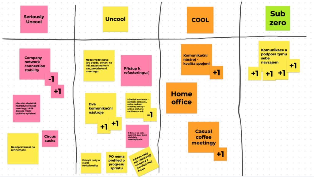 Znáte Cool zeď z pořadu Top Gear na které se hodnotí auta? Napadlo vás někdy v tomto duchu udělat retrospektivu? Vytvořte zeď přesně takovou, jako je na videu a požádejte váš tým, aby ji zaplnil čímkoliv, co považuje za důležité (firma, produkt, lidé, tým, procesy, …). Poté společně diskutujte, které věci byste chtěli posunout více doprava. Sloupec “Sub zero” je pomyslná nirvana, jakmile dosáhne kartička této úrovně, je natolik dobrá, že už na ní není co dále zlepšovat. Doporučujeme retrospektivu udělat znova třeba za čtvrt roku a uvidíte, co se změnilo.