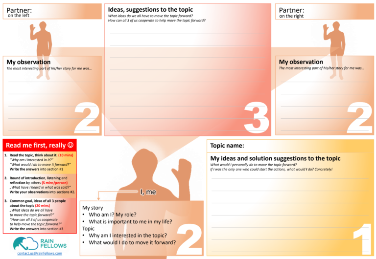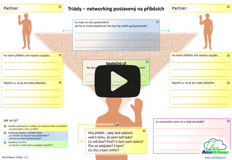 Každý dostane tužku a svůj triádový papír, kde najde instrukce a volné políčka, kam si během rozhovoru píše poznámky, které použije později. Vysvětlení použití nástroje můžete vidět na následujícím videu: