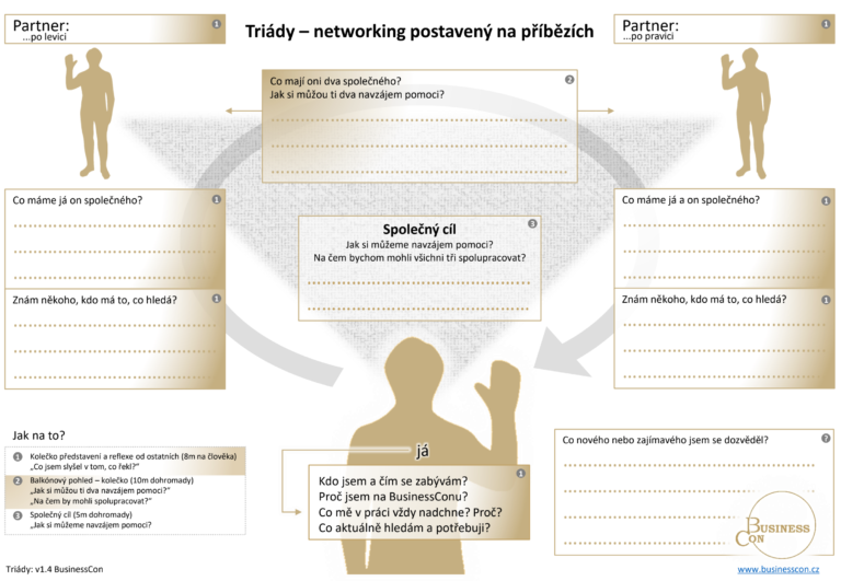 Na konferenci BusinessCon používáme tradičně triády hned ze startu na rozbití ledů mezi účastníky. Je to konference podnikatelů, proto jsme se v triádách namísto osobních hodnot zaměřili na to, jak si mohou podnikatelé navzájem pomoci, případně jaký nový business mohou společně nastartovat.