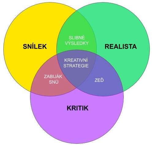 The method is based on simple principles — during brainstorming, take three different perspectives one by one. In practice, we recommend materializing them in the form of three different rooms, or different habitats within one room or hats, which we switch between during brainstorming. However, definitely do not mix these looks!