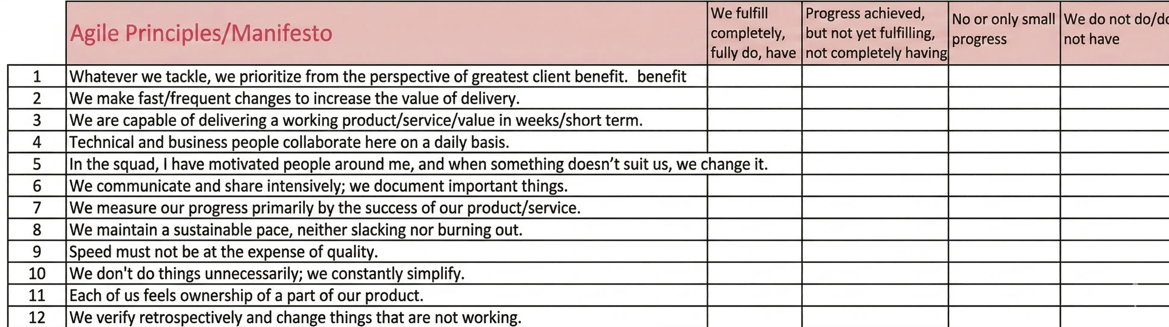 So we went back to the roots in our deliberations. Where is Agility defined? In the Agile Manifesto (https://agilemanifesto.org/.) 12 principles are defined here (https://agilemanifesto.org/principles.html), which must meet any methodology, procedural framework, be it SCRUM, Kanban, or anything else.