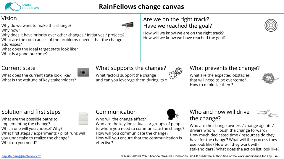 Change today isn't a choice – it's a necessity. But the way we manage it can determine the success or failure of the entire organization. The RainFellows Change Canvas is our attempt to give leaders and change agents a simple tool to help them navigate the complexity of changes and transformations.